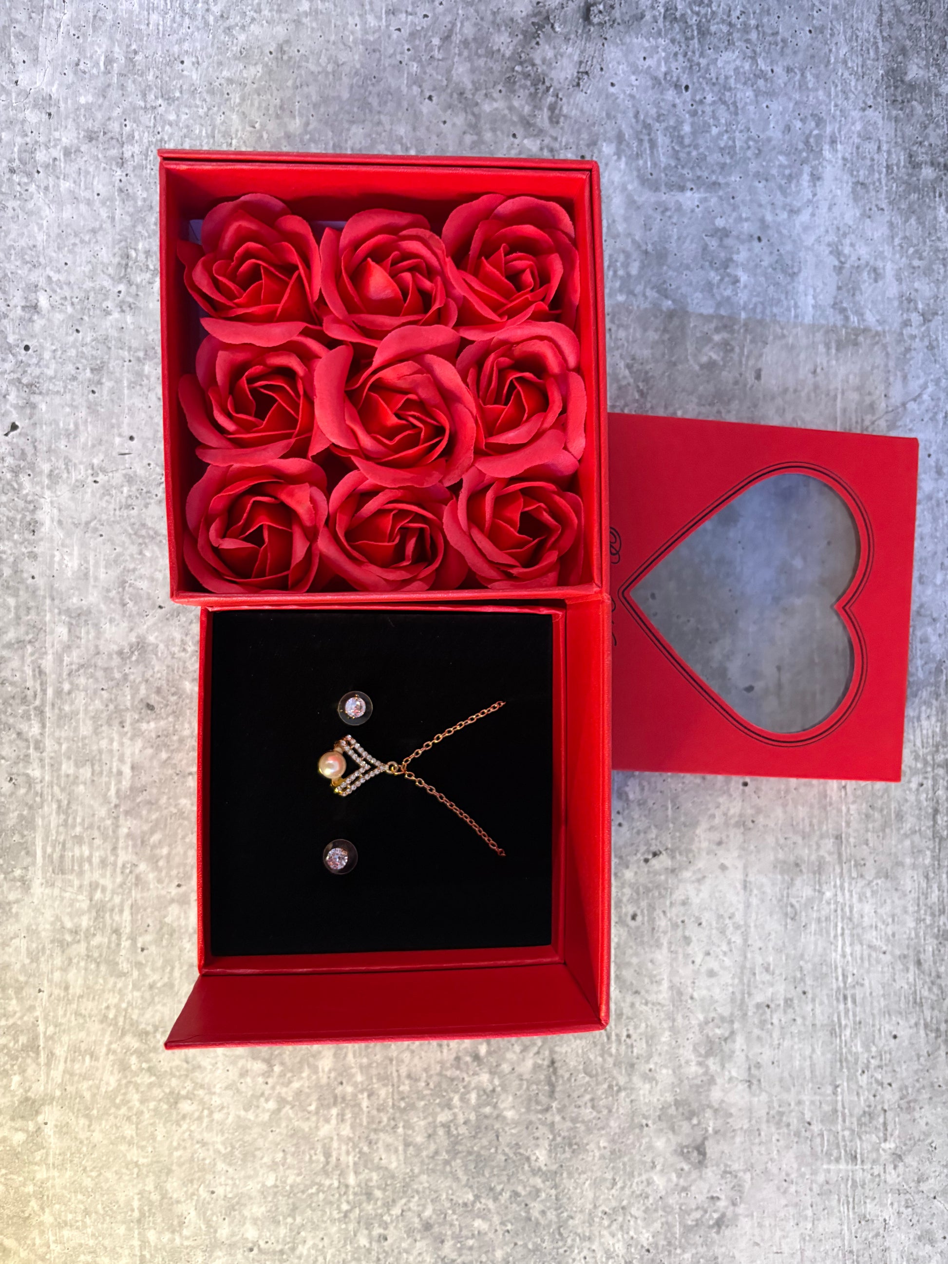 Make Valentine’s Day unforgettable with this stunning Red Rose Flower Gift Box 🌹✨. Designed to surprise, the box opens to reveal a hidden necklace and earrings 💎—a beautiful expression of love, elegance, and romance.