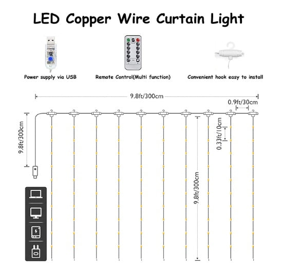 This Window Curtain String Light is the perfect choice for a variety of occasions. It comes with 300 LED bulbs, 8 lighting modes, and a remote control for convenient operation. It is USB powered, waterproof, and designed to last. With adjustable brightness and warm white light, it's ideal for use in bedrooms, parties, weddings, or Diwali decorations.